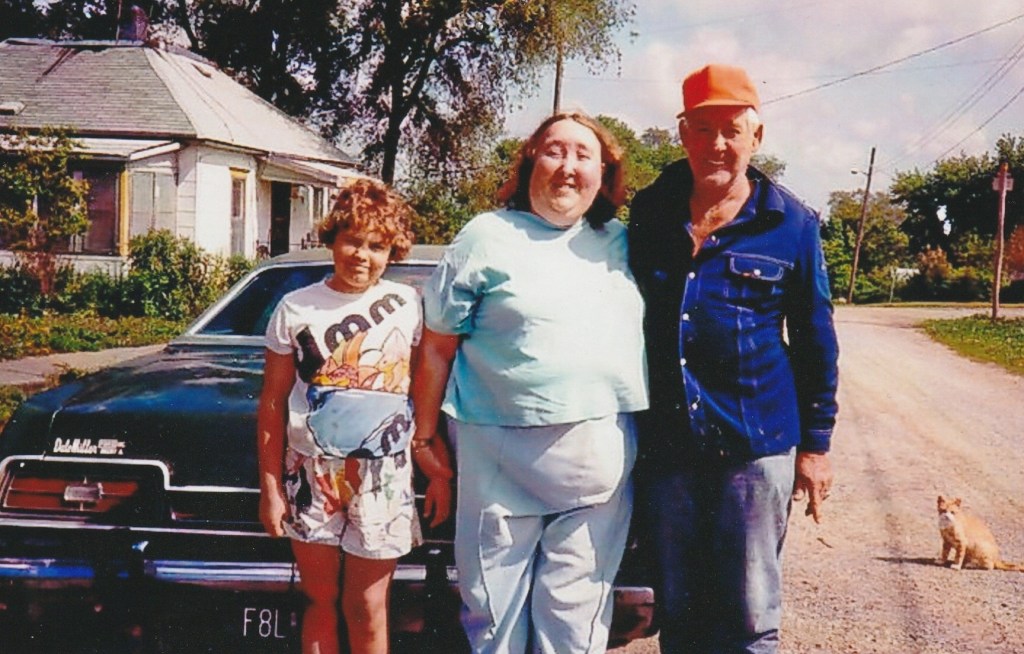 She said, “Shore. I better get out of the car” (though I really wanted the car in the shot). She swung herself out, looking like the doctor had forgotten to take the other thirty-pound tumor out of her stomach, and said, “Now wait for my husband.” So that was her husband, not her father, coming up the hill in a fluorescent seed cap and carrying a scrawny little kitten in one hand.